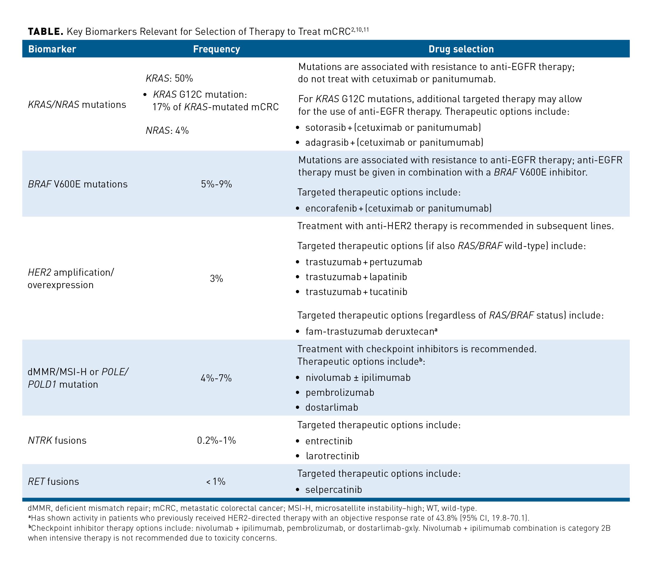 Molecular testing has accelerated the development of biomarker-targeted therapies for CRC, and it may improve outcomes of patients with metastatic disease.9 If biomarker testing indicates the presence of identifiable, targetable defects, then therapy can be tailored for that patient.2 The Table summarizes the range of biomarkers that may be relevant in guiding therapy for patients with mCRC.2,10,11 The 2024 NCCN Clinical Practice Guidelines in Oncology (NCCN Guidelines®) for Colon Cancer (version 1.2024) include checkpoint inhibitor therapy options: nivolumab ± ipilimumab, pembrolizumab, or dostarlimab-gxly. Nivolumab + ipilimumab combination is category 2B when intensive therapy is not recommended due to toxicity concerns.2