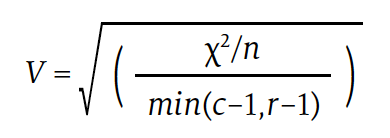 where n is the grand total of ED visits, c is the number of columns in a classification table, and r is the number of visit classes. The P value for the significance of V is the same as for Pearson’s χ2 statistic.