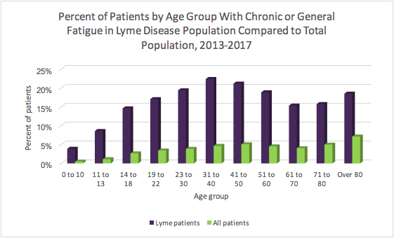 The contrast was even greater with respect to chronic or general fatigue. Individuals diagnosed with Lyme disease were much more likely to have chronic or general fatigue after their diagnoses than the total population. In the 31-to-40-year-old age group, 22% of the Lyme disease population were diagnosed with chronic or general fatigue compared to 5% of the total population in that age group.