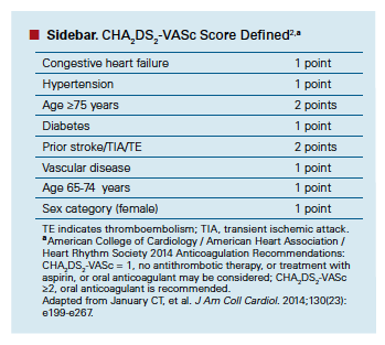 In NVAF, anticoagulant therapy is used for reducing the risk of stroke and systemic embolism and is longer term than in VTE. Also, the NVAF patient population tends to be older, has more comorbidities, and takes more medications for chronic conditions, introducing additional challenges to care. American College of Cardiology/American Heart Association/Heart Rhythm Society 2014 guidelines recommend use of an anticoagulant in patients with NVAF with a CHA2DS2-VASc score of 2 or more (see ),2 and in patients who have had a prior stroke or transient ischemic attack. Among those who use warfarin, maintaining INR within a therapeutic range (2.0-3.0) is critical to reducing the risk of stroke as well as bleeding. Guidelines recommend the use of NOACs as an alternative to warfarin.2
