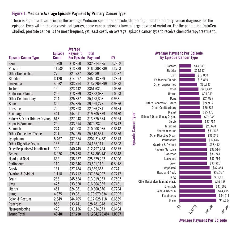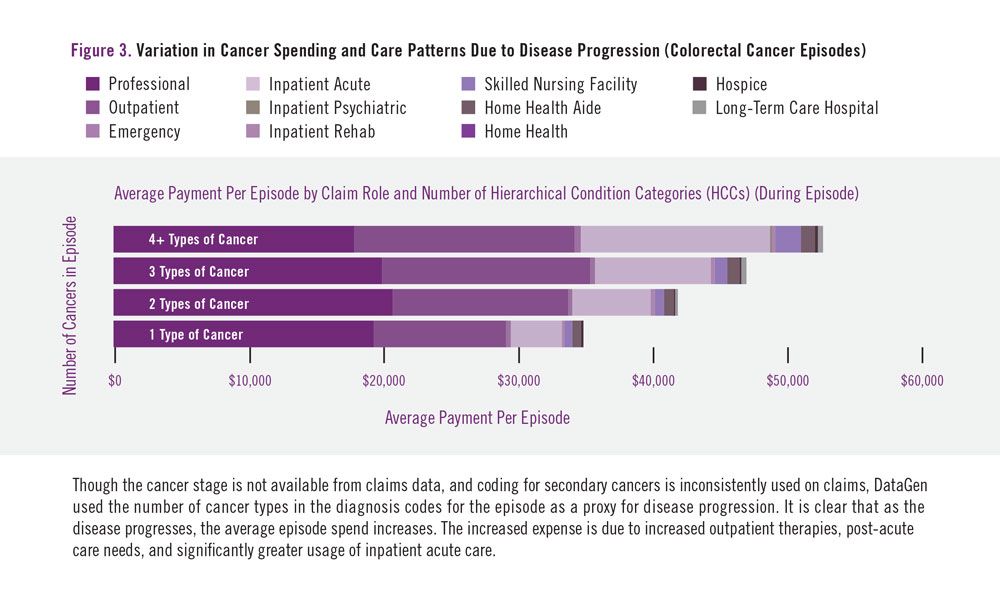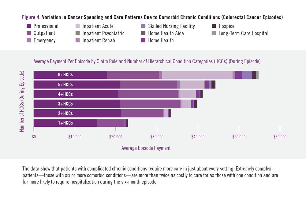 The findings validate the need for extensive risk adjustment, as there are many factors that influence care patterns and costs during a 6-month episode—most significantly, cancer type and comorbid chronic conditions.