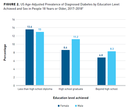 Approximately 37 million people in the United States (11.3% of the population) have diabetes, of which an estimated 8.5 million adults are undiagnosed.6 An additional 96 million adults in the United States have prediabetes.6 Diabetes-related complications such as stroke, chronic kidney disease, blindness, and amputation can cause substantial morbidity, contributing to annual diabetes direct medical costs of approximately $237 billion, $90 billion of which are related to reduced productivity (2017).7 Diabetes was also the eighth leading cause of death in the United States in 2020 after adjusting for age.8 While a common chronic condition, there are significant differences in the prevalence of diagnosed diabetes and outcomes in adults by race, ethnicity, SES, education, and age in the United States.9