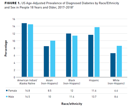 In addition to prevalence, diabetes quality of care, disease control, and outcomes are worse in minorities and individuals with low SES.10-12 For instance, Black Medicare beneficiaries with diabetes have worse glycemic control, are more likely to develop end-stage renal disease, and are significantly less likely to receive retinal eye exams than White patients.13-15