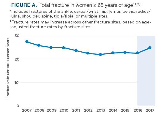 Osteoporosis-related fracture rates are on the rise.17 A retrospective analysis of the Optum Research Database from January 1, 2017 to May 31, 2017 in US commercial and Medicare plan members found that fracture rates among women ≥ 65 years of age declined from 2007 to 2013 and then plateaued until 2016.17 However, beginning in 2016, fracture rates increased across various fracture sites, including spine and multiple-site fractures (Figure A).17