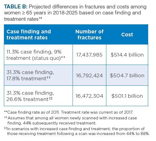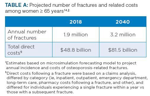 As the U.S. population continues to age and grow, the annual number of fractures among women ≥ 65 years of age is expected to increase. A microsimulation forecasting model projected that the incidence of osteoporosis-related fractures among US women ≥ 65 years of age would increase 68% from 2018 to 2040 (Table A).14 However, if case finding and treatment rates increase, the projected number of fractures and costs would decrease (Table B).14