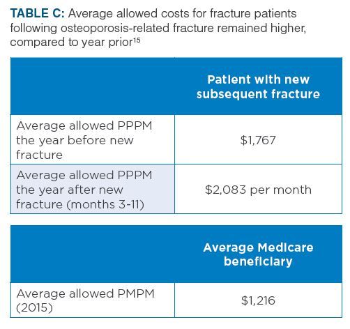 Costs for fracture patients continued to remain increased.15 Average allowed costs for fracture patients after the osteoporosis-related fracture remained higher compared to the year prior to the fracture: $2,083 per month in months 3 through 11 compared with $1,767 per month, after the year-by-year adjustment in cost data (Table C).15