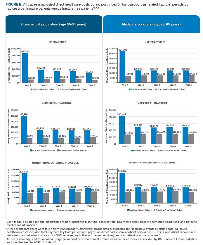 In the same analysis, patients with new fractures had higher average allowed per patient per month (PPPM) medical costs in the year before the new osteoporosis-related event compared with the 2015 average allowed per member per month (PMPM) for Medicare FFS patients ($1,767 compared with $1,216, after adjusting for differences in sex and age and trending to 2015 using Medicare cost trends).15