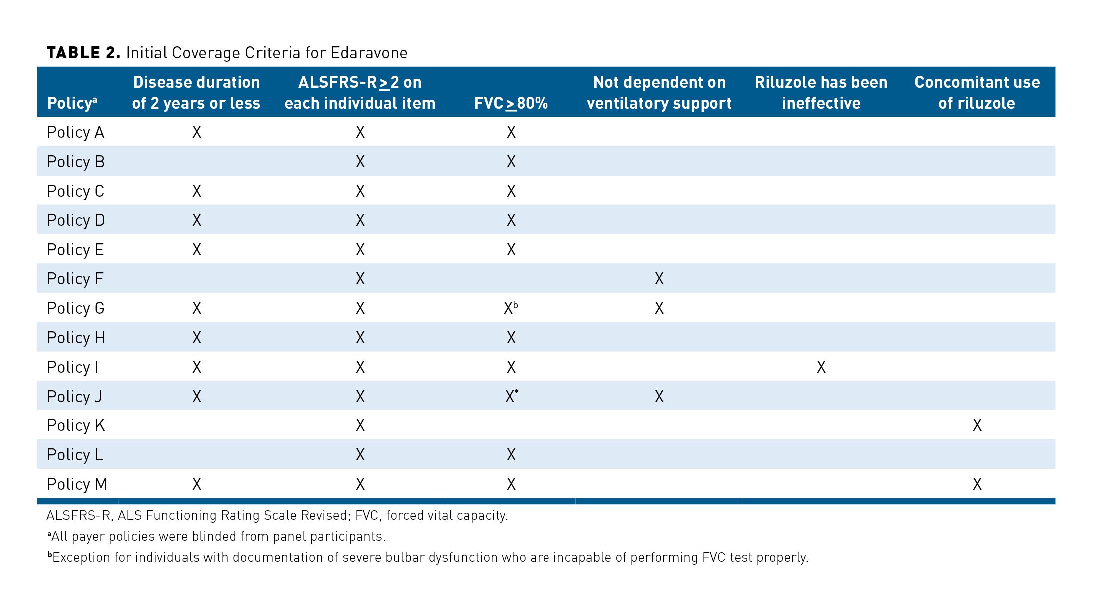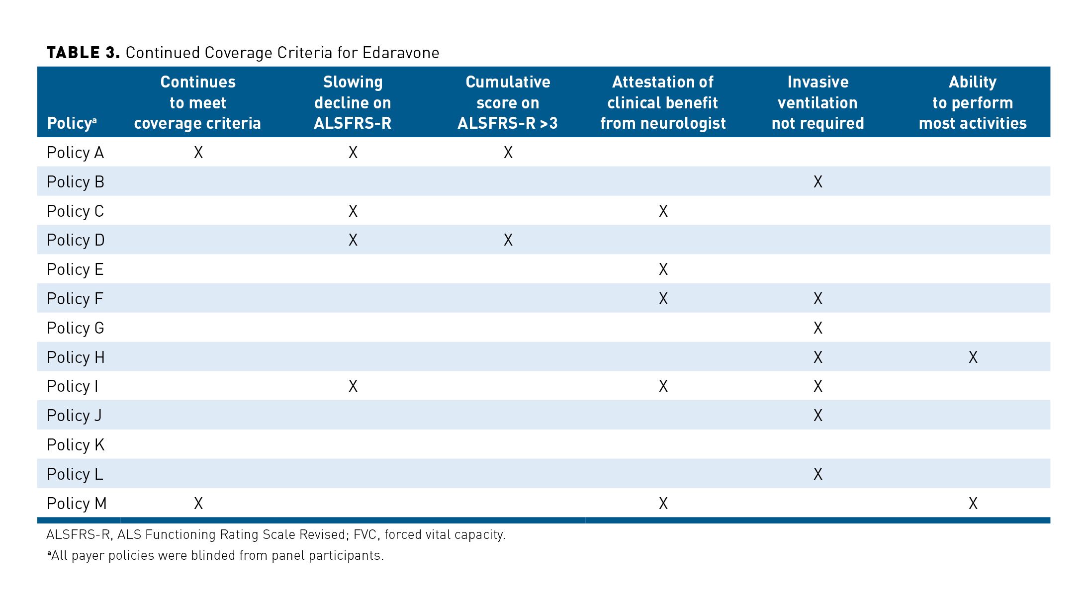 The panel concluded that the available evidence coupled with the diverse starting and continuation policy criteria warranted a reassessment of coverage criteria with the possibility of certain criteria being removed, such as the disease duration and FVC criteria, and other criteria being restructured, such as ALSFRS-R scores, and that treatment guidelines from organizations like the AAN would be useful and valuable in helping to better structure coverage policies to ensure access for appropriate patients. Overall, clear guidance and consensus on the role of edaravone in the treatment of ALS should lead to more consistent policy criteria for starting and continuation of therapy, leading to appropriate access to care for patients with ALS.