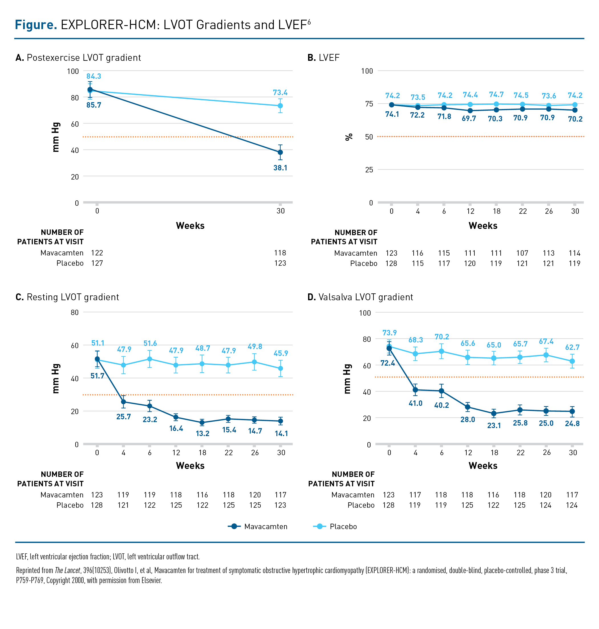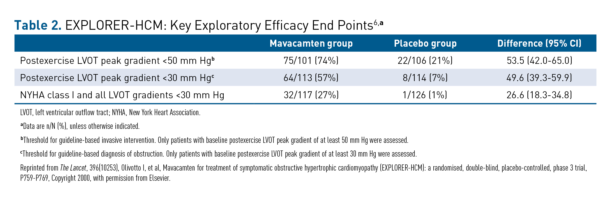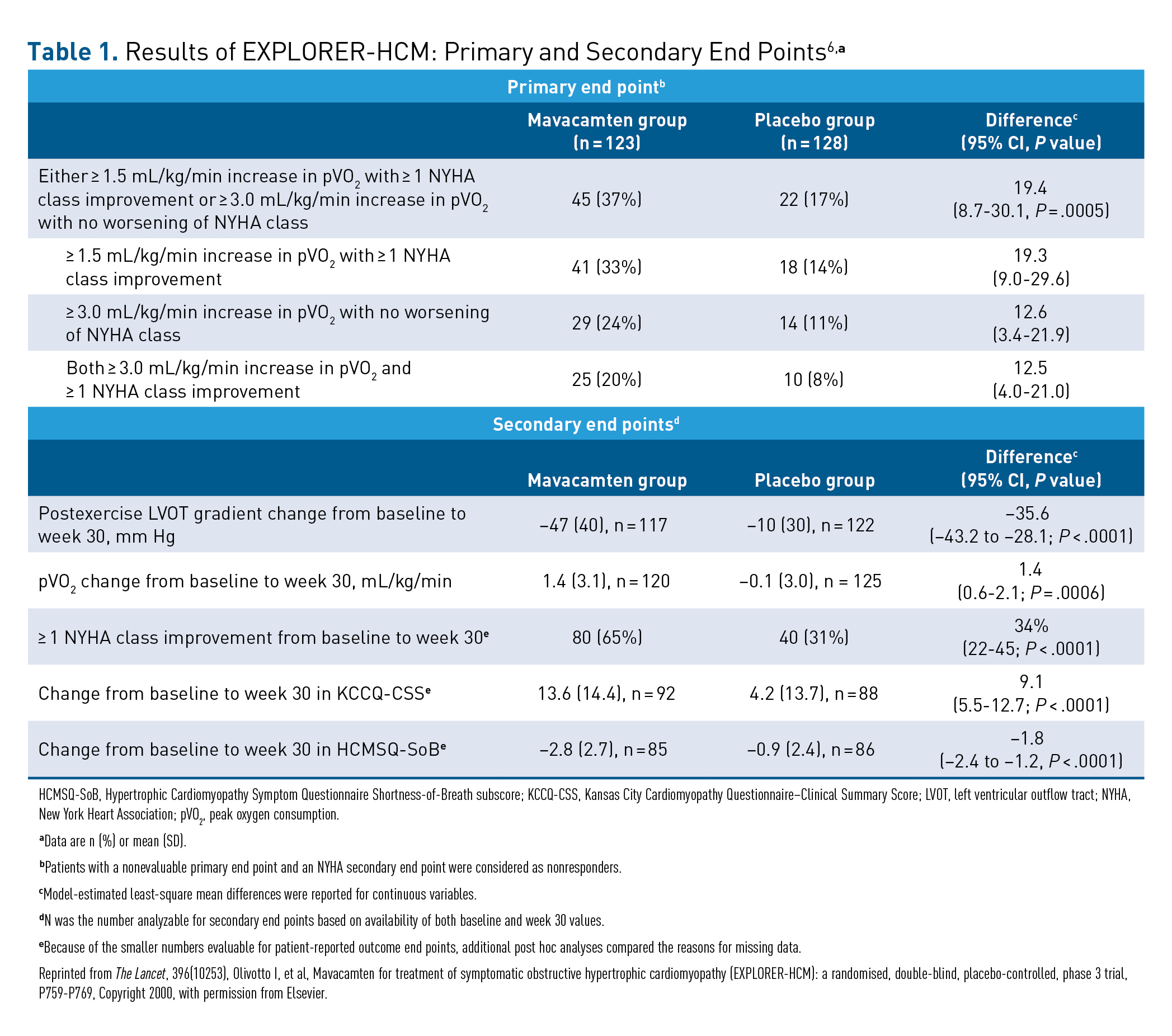 6. Olivotto I, Oreziak A, Barriales-Villa R, et al. Mavacamten for treatment of symptomatic obstructive hypertrophic cardiomyopathy (EXPLORER-HCM): a randomised, double-blind, placebo-controlled, phase 3 trial. Lancet. 2020;396(10253):P759-P769. doi:10.1016/S0140-6736(20)31792-X