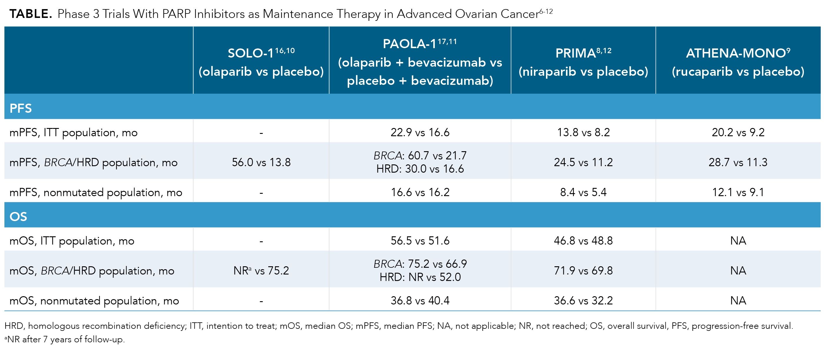 Optimizing patient selection for primary maintenance therapy relies on mutational testing for BRCA and HRD status. The PARP inhibitor olaparib (Lynparza; AstraZeneca) was first studied in the SOLO-1 trial in patients with BRCA-mutated aOC and demonstrated statistically significant benefits vs placebo through increased median PFS and OS10 (TABLE 6-12). The PAOLA-1 trial extended beyond BRCA mutations by also taking a glimpse into how patients with HRD performed on PARP inhibitors. This trial combined olaparib with bevacizumab (Avastin) in the investigational arm and compared it with placebo plus bevacizumab in the control arm.8 The addition of bevacizumab to maintenance therapy can be considered if patients received bevacizumab as part of their primary platinum-based therapy.3 Like the SOLO-1 trial, PAOLA-1 demonstrated improvements in PFS and OS for patients with BRCA mutations, but it also identified benefits for HRD-positive patients, including those without a BRCA mutation.11 Patients in the trial without mutations (BRCA wild type and/or HRD negative) did not have any significant PFS benefit from the addition of olaparib, and they also had shorter OS than the placebo group.11