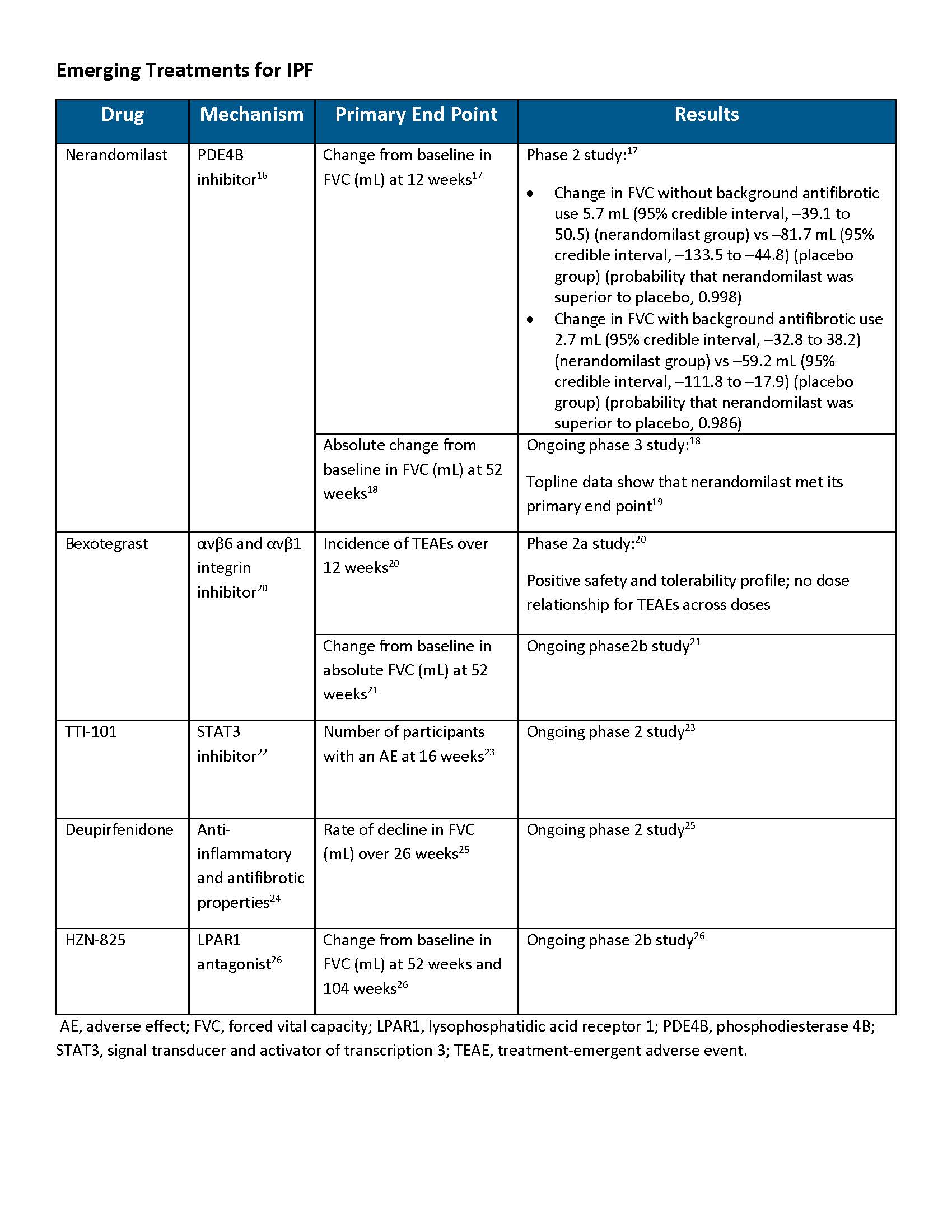 IPF is a progressive and fatal lung disease characterized by the scarring of lung tissue, leading to worsening respiratory function and significant morbidity. Its impact on patients is profound, with high health care costs, poor prognosis, and limited treatment options. Despite these challenges, recent clinical trial data offer hope, showcasing emerging therapies that may slow disease progression and improve patient outcomes. These advancements highlight the potential for new, more effective treatments, reinforcing the need for continued research and integration of novel therapies to address the unmet needs of patients with IPF and reduce the disease’s burden on health care systems.
