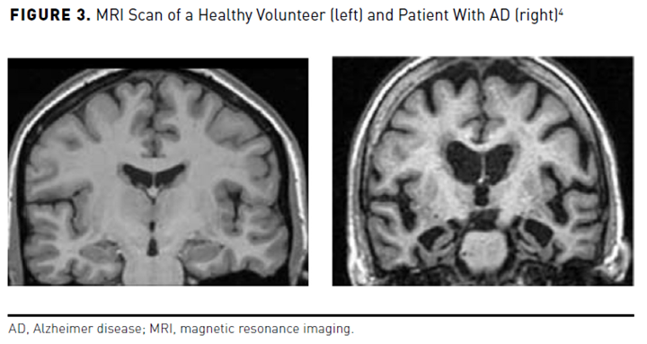 The International Working Group recommends that a confirmed diagnosis of AD must include both the presence of biomarkers (Aβ and tau positivity) and specific clinical phenotypes common to AD (amnestic AD, logopenic variant primary progressive aphasia, and posterior cortical atrophy). However, in clinical practice, biomarker data are not commonly used, partly due to costs and limited access.16 MRI is used to show the contrast between gray and white matter. Figure 34 shows a side-by-side comparison of a healthy volunteer and someone with AD. The AD brain shows atrophy, dilation of the lateral ventricle, and a smaller hippocampus.4 An MRI is used to rule out other conditions such as strokes, tumors, brain trauma, and evidence of cerebral atrophy. Additional diagnoses to rule out that can mimic or exacerbate symptoms of AD include depression, dehydration, electrolyte and metabolic abnormalities, anemia, ischemia, hypoxia, thyroid and vitamin deficiencies, and infections (eg, pneumonia, urinary tract infection, HIV, tertiary syphilis).1 Blood-based biomarkers revealing Aβ, phosphorylated tau 217, and neurofilament light in the CSF have been investigated and validated in clinical research. This less invasive test may assist in earlier and more accurate diagnosis of AD and may become a part of the diagnostic workup once FDA approval is received, and the cost is more practical.17-20