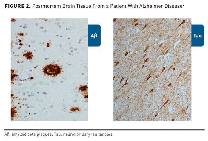 The pathophysiology of AD is multifactorial, which makes treating and curing the disease difficult (Figure 18). The pathological hallmarks of AD are cerebral plaques containing aggregates of Aβ derived from amyloid precursor protein as well as neurofibrillary tangles (NFTs) that contain hyperphosphorylated and aggregated tau (Figure 24).4,8 The accumulation of Aβ is thought to be the initial insult, which is the basis for the amyloid cascade hypothesis and abnormal phosphorylation of tau protein, creating the formation of NFTs within neurons.9 It has also been hypothesized that microglial activation results from Aβ formation. This microglial activation assists in clearing Aβ in the normal brain, but in the AD brain, this process may become less efficient with time, and the sustained microglial activation may enhance the core pathology of AD.10 Acetylcholinesterase, an enzyme that usually causes the hydrolysis of acetylcholine, may promote Aβ assembly by forming stable complexes with Aβ fibrils. These complexes are more dangerous to neurons than the fibrils alone, which may explain why the cholinergic neurons are destroyed.11,12 Hyperphosphorylated tau ensues disassembly of microtubules damaging the cytoskeleton and signal transduction in neuronal cells.8 Degeneration of neurons, particularly cholinergic neurons, which are the seat of memory processes, has been noted and evidenced as atrophy that is appreciated via brain imaging. It is hypothesized that this degeneration contributes to the explanation for memory decline and forms a theoretical justification for pharmacologic therapies that support cognitive function. It is also postulated that this degeneration can contribute to radical formation that may cause inflammatory processes in the brain that further impair brain function.8,10 Neuroinflammation occurs when injury, infection, or disease stimulates brain cells to produce proinflammatory mediators, such as cytokines and chemokines, that ultimately contribute to neuronal damage and death.13 Genetic data and imaging suggest that Aβ plaque deposition occurs before cortical tau pathology.9