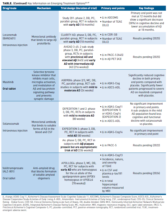 A hallmark of AD is the formation of Aβ plaques and NFTs, which are the focus of many investigational treatments under development.9 Novel treatments that target the dysregulated process before Aβ and tau pathology could be imperative to the treatment landscape. Investigational treatments are summarized in the Table.46-69 In the United States, donanemab, gantenerumab, and lecanemab have received recognition as breakthrough therapy and are expected to go through an accelerated approval process by the FDA over the next 1 to 2 years.
