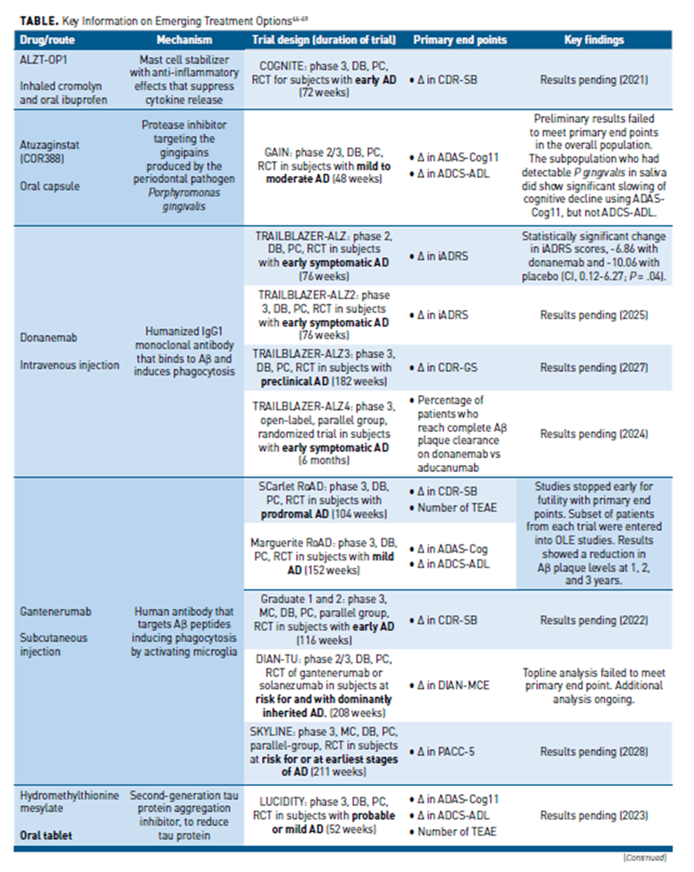Lecanemab is a monoclonal antibody that binds to large Aβ protofibrils, a soluble toxic version of Aβ, leading to their removal.72 A phase 2 clinical trial, Study 201, evaluated the efficacy and safety of lecanemab.60,72 Although the analysis at 12 months did not meet the primary end point of significantly improving Alzheimer’s Disease Composite Score, it did not meet futility conditions. The 18-month data did show a significant decrease of 30% in cognitive decline and a lower accumulation of Aβ. An open-label extension study is ongoing.72 CLARITY AD is a phase 3 study that evaluates the efficacy of lecanemab in patients with early AD, and the primary end point is the change from baseline CDR-SB.61 The phase 3 study AHEAD3-45 has 2 sub-studies of patients that are cognitively normal but have elevated brain amyloid.62