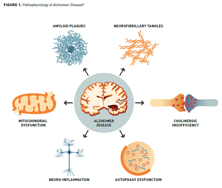 AD affects 6.5 million people in the United States and 30 million to 35 million people worldwide. The prevalence of AD is projected to increase to 13.8 million and 150 million people in the United States and worldwide, respectively, by 2060. The most significant risk factor for developing the disease is age; the older one is, the more likely they are to experience the disease, with an 11% chance of developing AD for individuals older than 65 years and a 33% chance for individuals older than 85 years.3,4 In age-specific global prevalence of AD, women are 1.17 times more likely than men to have a diagnosis of AD.5 Also, Hispanic and African American individuals are 1.5- to 2-fold more likely than White individuals to experience AD.1 Other risk factors include the accumulation of β-amyloid (Aβ) and tau, as well as genetics, female gender, lower level of education, lifestyle behaviors (ie, smoking, diet, exercise, and high alcohol intake), concomitant diseases (ie, sleep disorder, diabetes, cardiovascular [CV] disease, obesity), and environmental factors.2-4,6,7