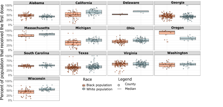 Exhibit 1: Box and whisker plots of the COVID-19 first dose vaccination rate for Black (orange) and White (blue) residents of the 13 states within our sample. The dots correspond to the individual counties within the respective state. The prominent, horizontal black line indicates the median state vaccination rate among the counties. Due to concerns about data quality, only 13 out of the 22 states are included. States were included if their county-level aggregates were consistent with state-level reporting from national sources.