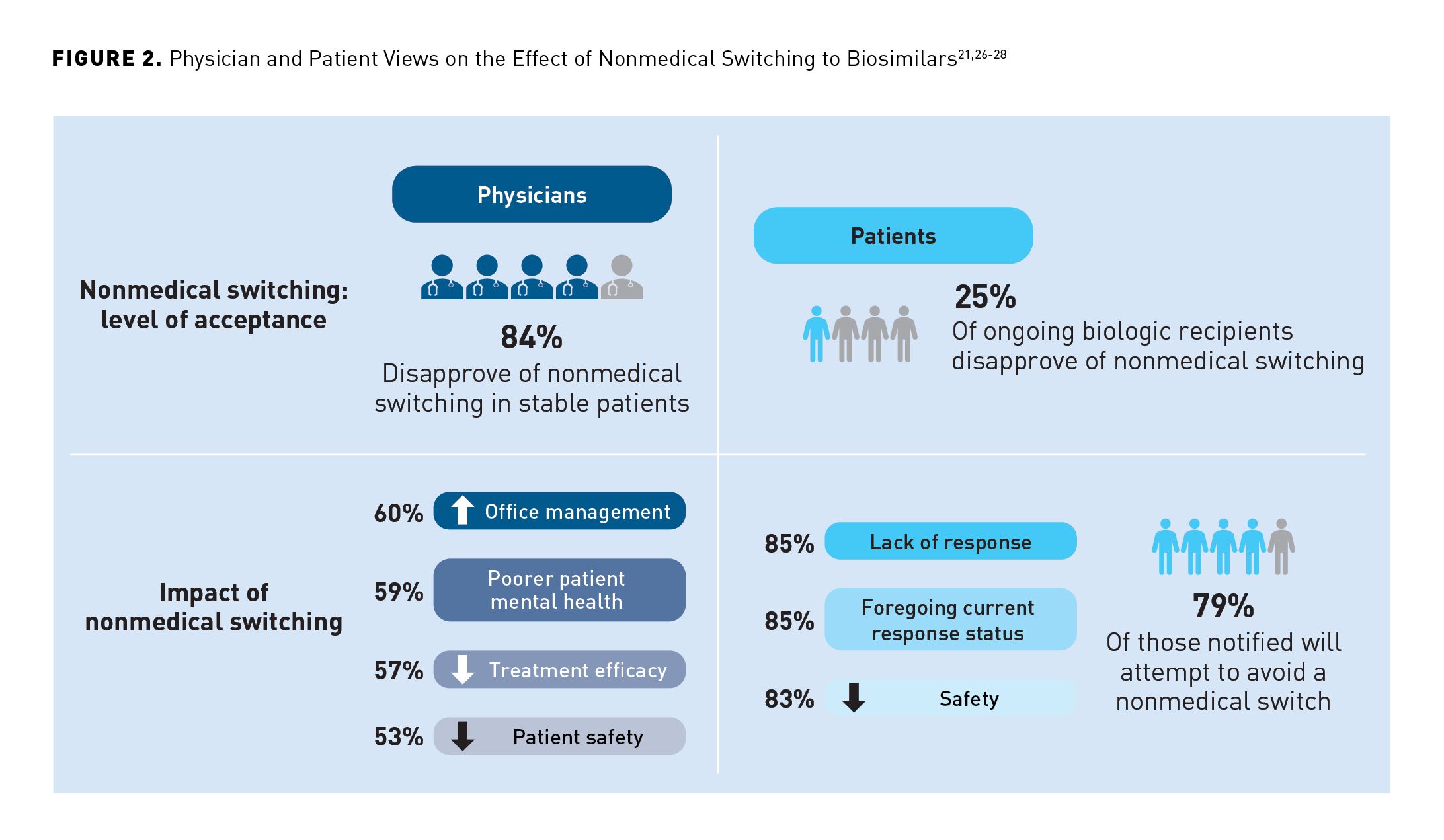 In a survey of US physicians published in 2019, over 80% expressed concerns regarding nonmedical switching to biosimilars and the impact such switching would have on patient care and physician practice (Figure 2).21,26-28 In a 2019 survey of 320 US rheumatologists who prescribed tumor necrosis factor-α inhibitors, a higher proportion of respondents stated that they were more likely to initiate biosimilar treatment for a biologic treatment–naive patient with rheumatoid arthritis than they were to switch to the biosimilar for a patient with rheumatoid arthritis doing well on the reference product (73% vs 35%).21 Likewise, in a 2020 survey of 602 specialists who regularly prescribed biologic medications to their patients, physicians were more likely to prescribe a biosimilar to patients who were newly starting therapy than to patients who were already successfully established on a reference product.11 Given that biosimilar switching is often resisted by physicians when dealing with patients already stabilized on a biologic therapy, it is not surprising that this sentiment was expressed with respect to nonmedical switching in an online survey published in 2019, with 84% of physicians expressing concern about this practice.26