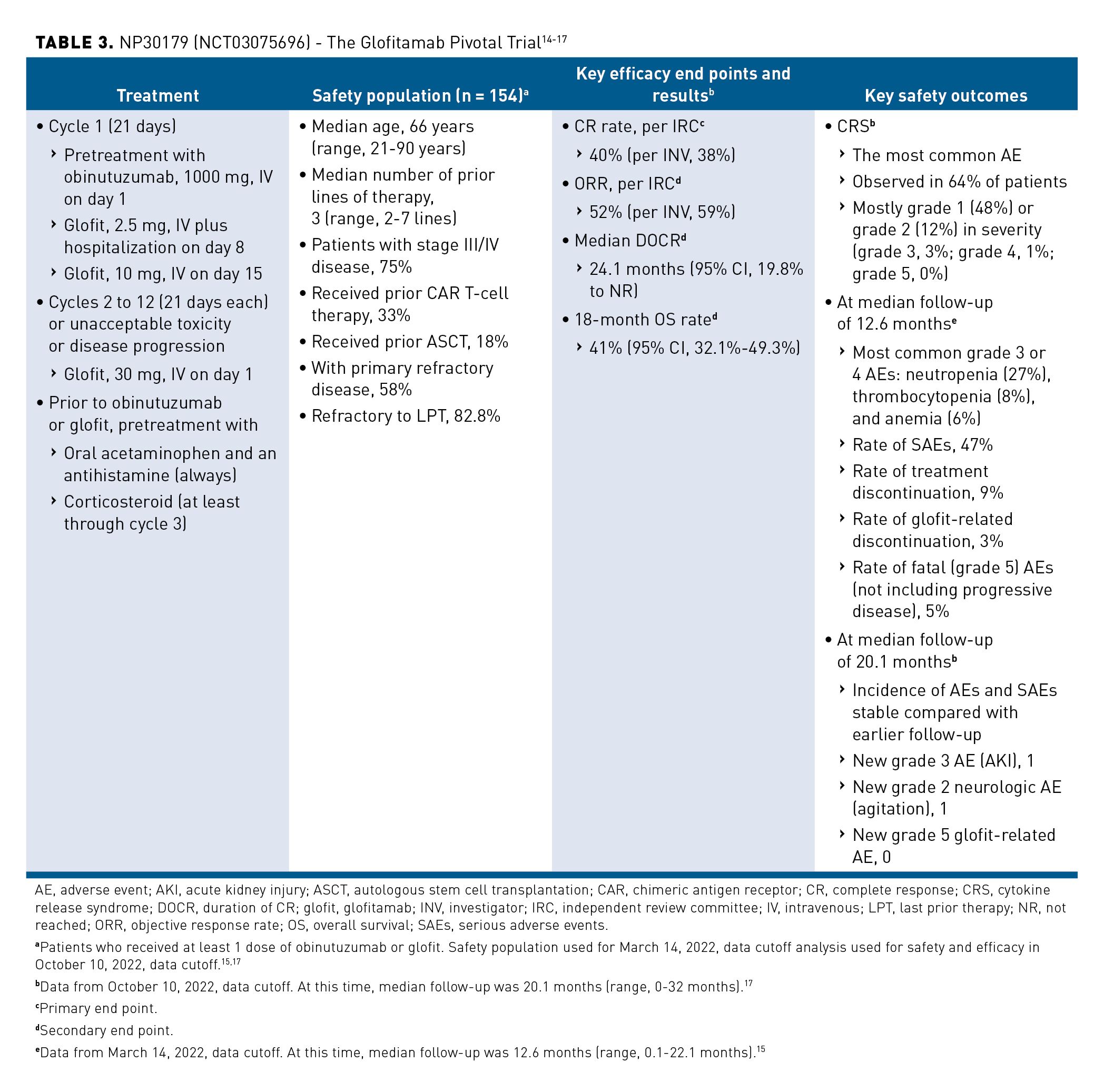 FDA approval was based on results of the NP30179 trial (NCT03075696), which evaluated the safety and efficacy of glofitamab as a monotherapy (Table 3).14-17 The open-label, multicenter, single-arm, phase 1/2 study enrolled adults with relapsed or refractory DLBCL, ECOG performance status of 0 or 1 at baseline, and 2 or more prior lines of therapy including an anti-CD20 therapy and at least 1 anthracycline-containing treatment (N = 155). At median follow-up of 20.1 months (range, 0-32 months), treatment with glofitamab was associated with CR rate per IRC of 40% (38% per investigator [INV]) and ORR per IRC of 52% (59% per INV). Median duration of CR was 24.1 months (95% CI, 19.8 months to NR) and the 18-month OS rate was 41% (95% CI, 32.1%-49.3%). CRS, the most common AE, was observed in 64% of patients and was mostly grade 1 (48%) or grade 2 (12%) in severity (grade 3, 3%; grade 4, 1%; grade 5, 0%). Incidence of AEs and SAEs remained stable compared with an earlier analysis that had a median follow-up of 12.6 months.17