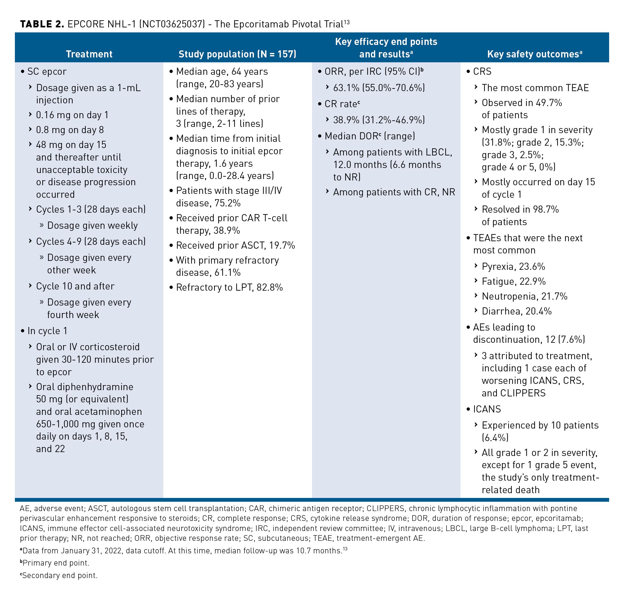 FDA approval was based upon results of the EPCORE NHL-1 trial (NCT03625037), which evaluated the safety and efficacy of epcoritamab as a monotherapy (Table 2).12,13 The open-label, multicenter, single-arm, phase 1/2 study enrolled adults with R/R CD20+ large BCL (LBCL), ECOG performance status of 0 to 2 at baseline, 2 or more prior lines of therapy including an anti-CD20 therapy, and prior failure with or ineligibility for autologous stem cell transplantation (ASCT) (N = 157). Overall, 88.5% (n = 139) of study participants had DLBCL. At median follow-up of 10.7 months, treatment with epcoritamab was associated with ORR per IRC of 63.1% (95% CI, 55.0%-70.6%), and the CR rate was 38.9% (95% CI, 31.2%-46.9%). Among patients with de novo DLBCL (n = 97), epcoritamab treatment was associated with an ORR of 60.8% (95% CI, 50.4%-70.6%) and a CRR of 46.0% (95% CI, 29.3%-61.5%). Among patients with transformed DLBCL (n = 40), epcoritamab treatment was associated with an ORR of 67.5% (95% CI, 50.9%-81.4%) and a CRR of 45.0% (95% CI, 29.3%-61.5%). The median DOR among all patients was 12.0 months (95% CI, 6.6 months to NR) and was NR among complete responders. CRS, the most common treatment-emergent AE (TEAE), was observed in 49.7% of patients and was mostly grade 1 in severity; it mostly occurred on day 15 of cycle 1, and it resolved in 98.7% of patients. ICANS was experienced by 10 patients (6.4%) and accounted for the study’s only treatment-related death.13