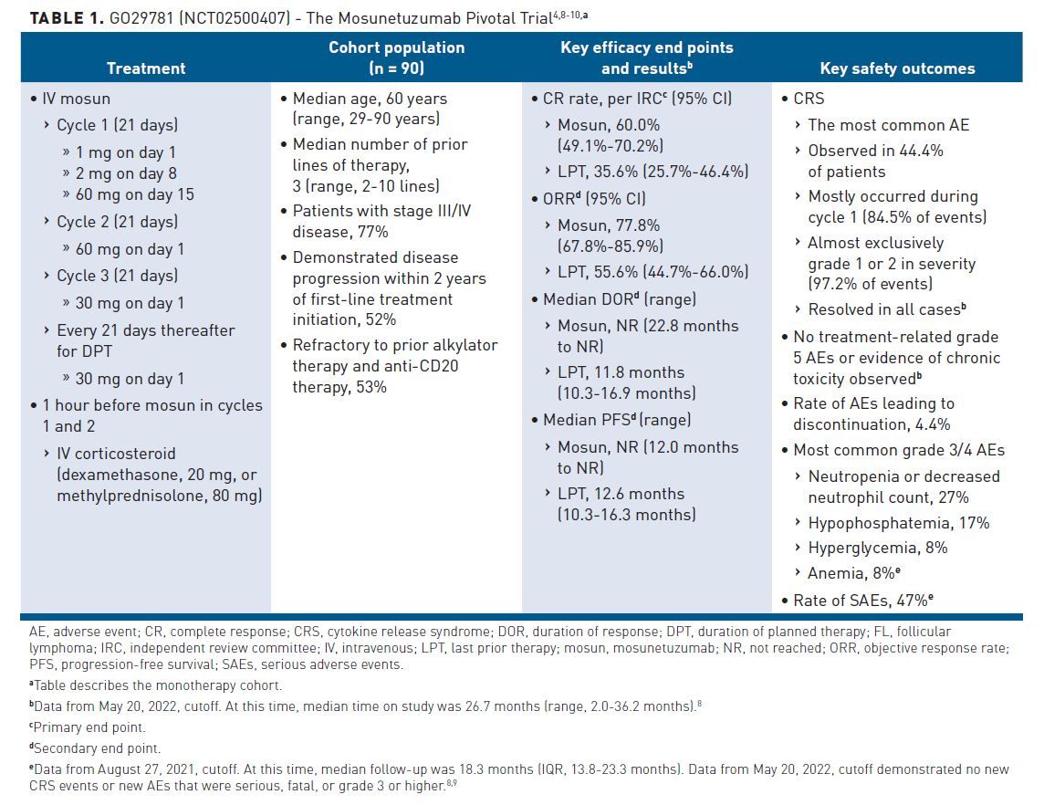 FDA approval was based on the results of the GO29781 trial (NCT02500407), which evaluated the safety and efficacy of mosunetuzumab as monotherapy and in combination with atezolizumab (Table 1).4,8-10 The open-label, multicenter, multi-cohort, phase 1/2 study enrolled patients with FL who had an ECOG performance status of 0 or 1 at baseline and who had had at least 2 prior lines of therapy including an anti-CD20 therapy and an alkylating agent. Compared with last prior therapy (LPT), monotherapy with mosunetuzumab (n = 90) was associated with improved rate of complete response (CR) as determined by an independent review committee (IRC), duration of response (DOR), progression-free survival (PFS), and objective response rate (ORR) after a median time on study of 26.7 months (range, 2.0-36.2 months). Treatment with mosunetuzumab correlated with CR rate per IRC of 60.0% (95% CI, 49.1%-70.2%), median DOR that was not reached (NR) (range, 22.8 months to NR), median PFS that was NR (range, 12.0 months to NR), and ORR of 77.8% (95% CI, 67.8%-85.9%).8-10 CRS, the most common adverse event (AE), was observed in 44.4% of patients; it mostly occurred during cycle 1 (84.5% of events), was almost exclusively grade 1 or 2 in severity (97.2% of events), and was resolved in all cases. No treatment-related grade 5 AEs or evidence of chronic toxicity was observed, and the rate of AEs leading to discontinuation was 4.4%.8
