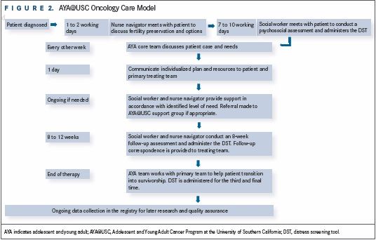 The AYA@USC clinical team works collaboratively with existing disease-specific oncology teams to bring the AYA perspective to patient care, focusing on the unique needs of this population such as fertility and psychosocial concerns. The team, comprised of 2 medical directors (pediatric oncologist and adult oncologist), a program manager, 3 part-time nurse navigators (NNs), and a social worker (SW), have streamlined resource utilization through the development of efficient algorithms within the USC and CHLA community networks. This algorithmic model of care ensures that protocol-defined patients are appropriately assessed by both nursing and social work disciplines as they assist patients with gaining access to needed services, referrals, follow-up care, and provide education uniquely tailored to AYAs. Each disease-specific oncology team identifies an AYA “champion” and provides feedback to AYA@USC.