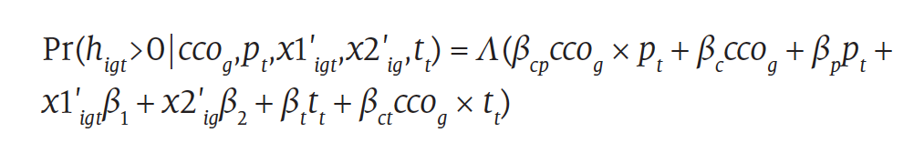 where Λ is the cumulative logistic distribution, i denotes a woman, g is an individual CCO, t indexes a month, and the βs are coefficients to be estimated. We modeled binary hospitalization variables specified in higt as a function of the policy-group indicator (ccog), the post-CCO period indicator (pt), and the interaction term of the policy-group and post-CCO period indicators (ccog × pt), as well as covariates. The policy-group indicator identifies women continuously enrolled in Medicaid who were either enrolled in a CCO or were not and thereby adjusts for baseline heterogeneity between the policy and reference groups. The post-CCO indicator identifies CCO-specific postimplementation periods, adjusting for an average pre—post trend in hospitalization. The coefficient on the interaction term (βcp) is our main interest, as it measures an additional change in the outcome attributable to CCO enrollment.