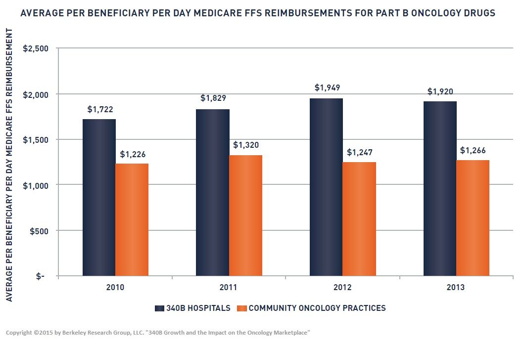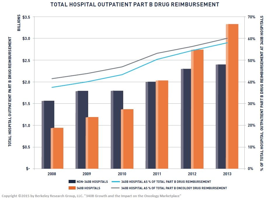 An examination of Medicare Part B hospital outpatient spending shows that 340B institutions accounted for 58% of all spending on drug payments in 2013, with oncology drugs making up 40% of the Medicare fee-for-service costs. The study, by Aaron Vandervelde of the Berkeley Research Group of Washington, DC, was sponsored by the Community Oncology Alliance (COA), which has sounded the alarm about unrestrained 340B growth in recent years.
