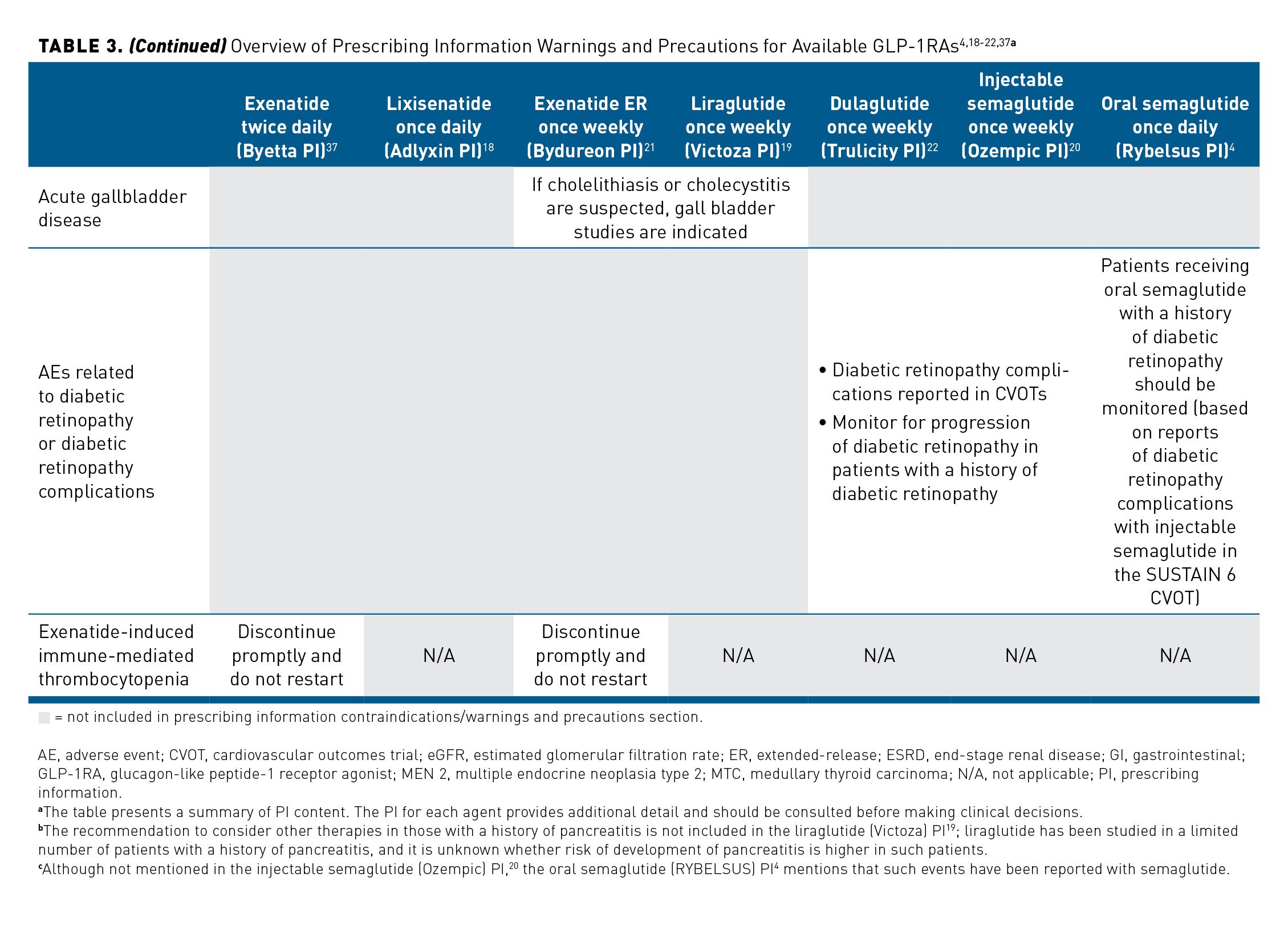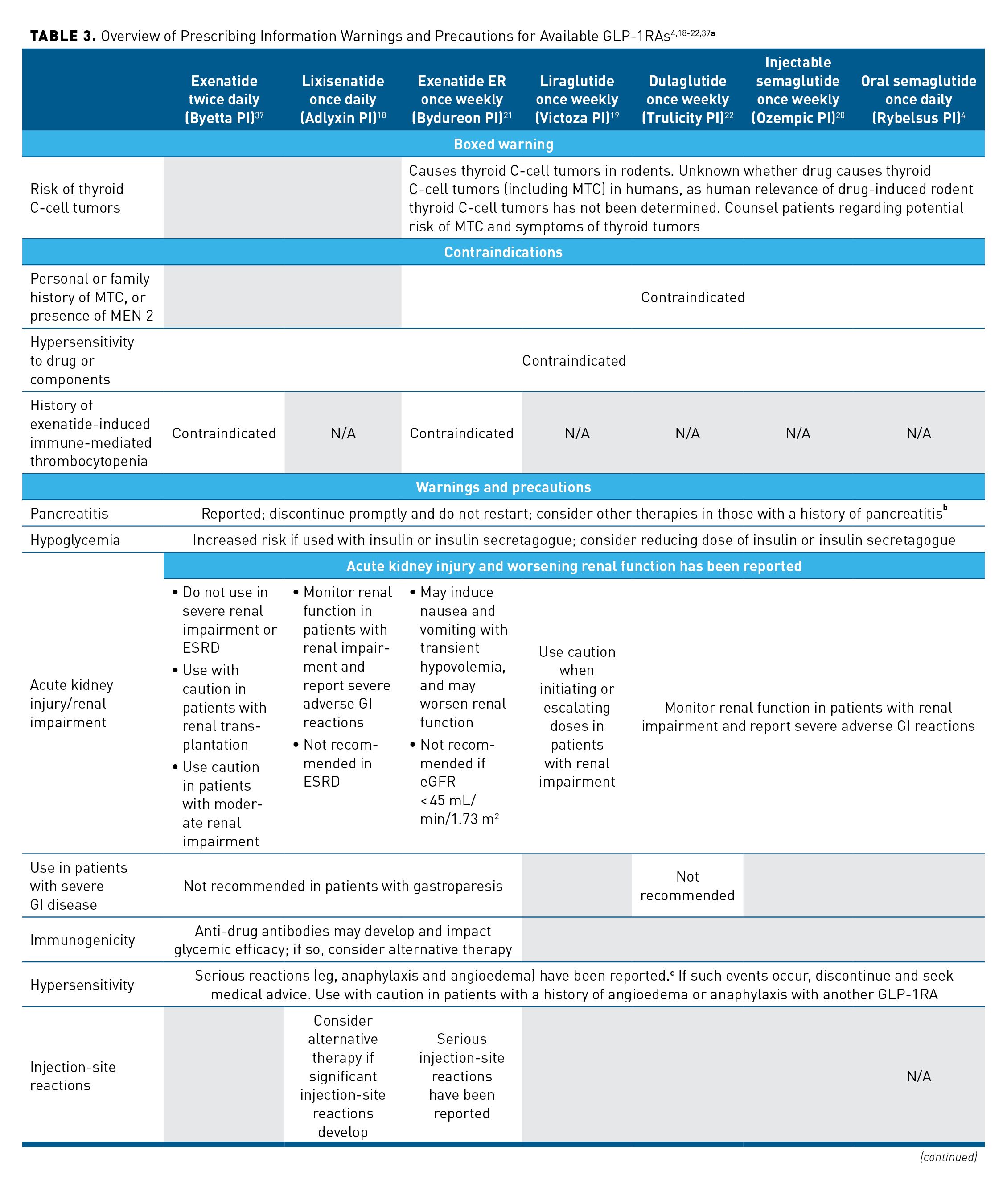 Several precautions need to be considered when using GLP-1RAs, many of which are common across the class. These are summarized in Table 3,4,18-22,37 and select considerations are discussed in more detail below.