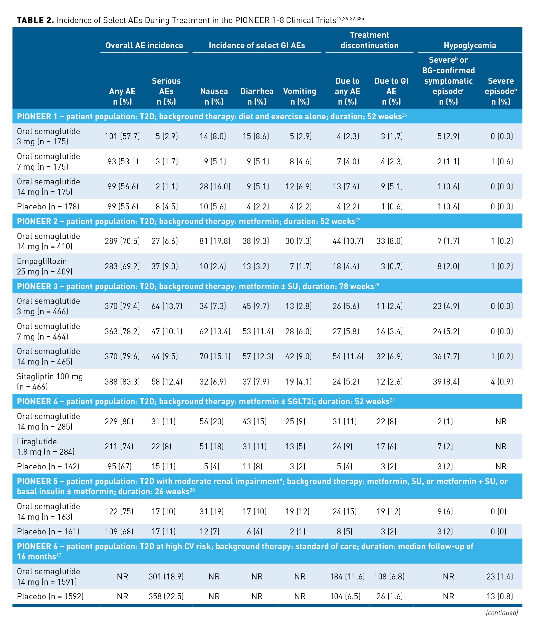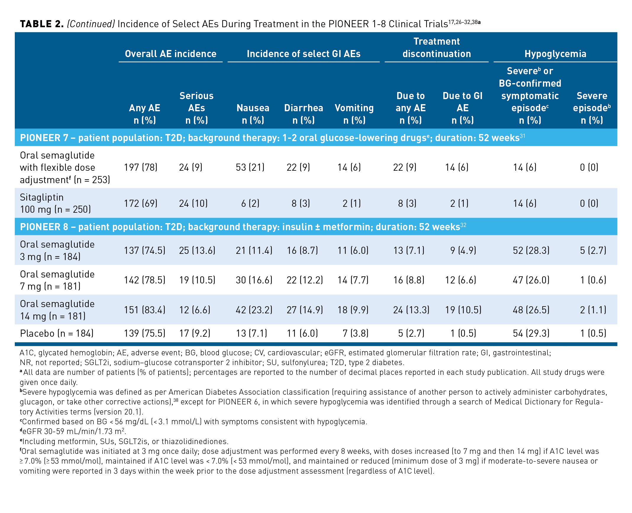 Relative to other active comparators, discontinuations due to any AE in PIONEER 3 were similar between oral semaglutide 3 mg (5.6% of patients), 7 mg (5.8%), and sitagliptin 100 mg (5.2%), and comparable between oral semaglutide 14 mg (11.0%) and liraglutide 1.8 mg (9.0%) in PIONEER 4.28,29 Discontinuations were more common with oral semaglutide 14 mg (10.7%) compared with empagliflozin 25 mg (4.4%) in PIONEER 227; more frequent with oral semaglutide 14 mg (11.6%) versus sitagliptin 100 mg (5.2%) in PIONEER 328; and more common with flexible-dose oral semaglutide (up to 14 mg; 9%) versus sitagliptin 100 mg (3%) in PIONEER 7 (Table 217,26-32,38).31