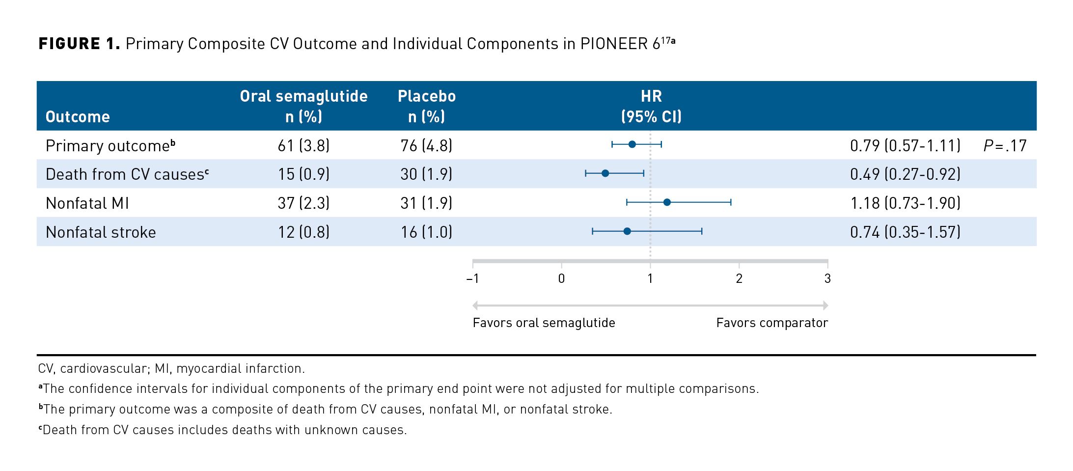 Over a median follow-up of 15.9 months, the composite MACE end point was reported in 3.8% of patients in the oral semaglutide group versus 4.8% in the placebo group (HR, 0.79; 95% CI, 0.57-1.11), demonstrating noninferiority of oral semaglutide to placebo (P <.001), but not superiority (P = .17).17 When the individual MACE components were analyzed, a nominally significant reduction in the risk of death from CV causes was observed (HR, 0.49; 95% CI, 0.27-0.92), although the study was not sufficiently powered to establish superiority for this outcome. The confidence intervals for the other MACE components did not show any difference between treatments (Figure 1).17 The PIONEER 6 study investigators concluded that the CV risk profile of oral semaglutide was noninferior to placebo.