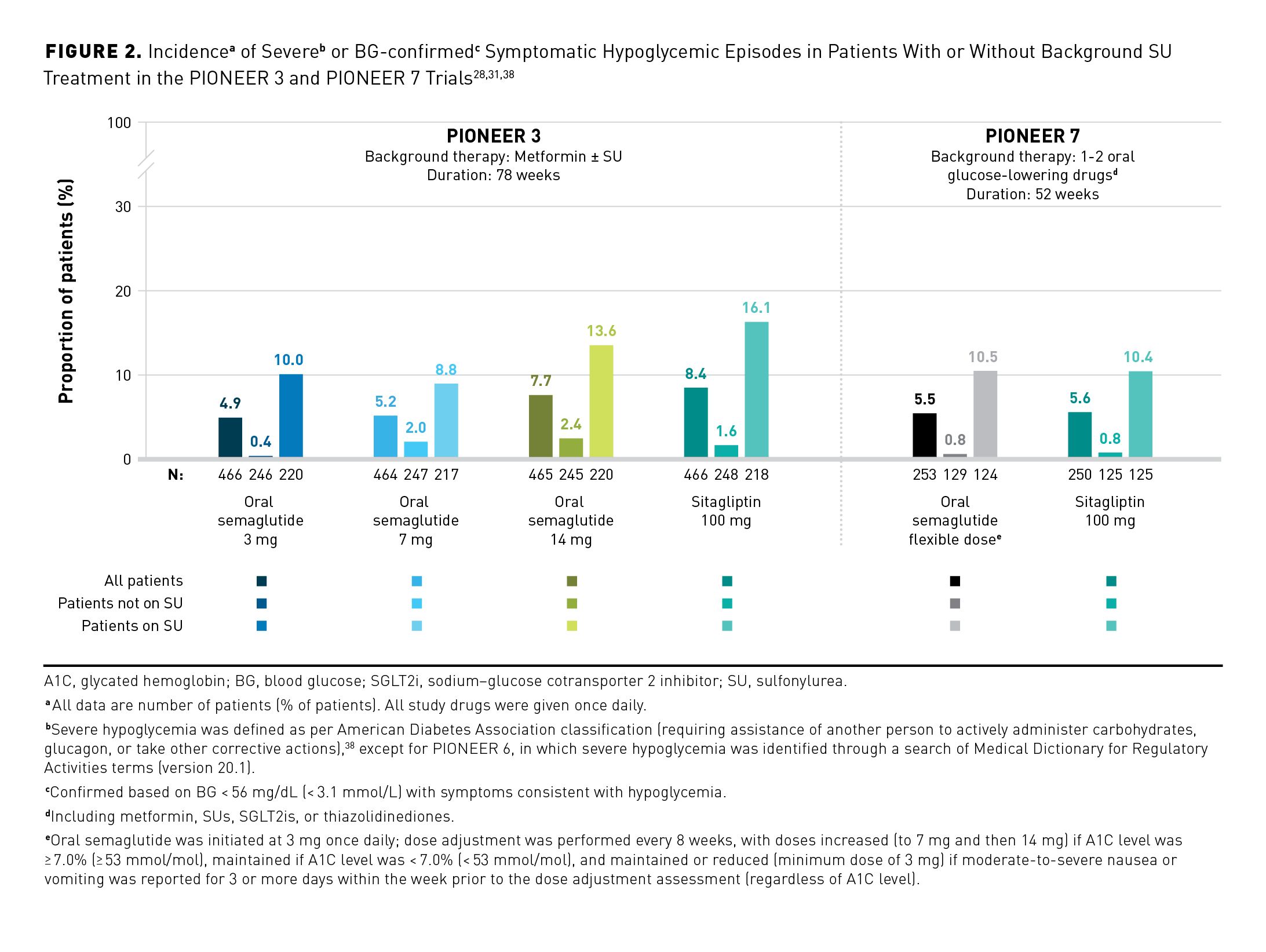 In PIONEER 3 and PIONEER 7, an elevated incidence of severe or blood glucose–confirmed symptomatic hypoglycemia was observed when oral semaglutide was added to a sulfonylurea (Figure 2).28,31,38 Similar observations were made with the combination of the DPP-4i sitagliptin and sulfonylureas.28,31 Consideration should therefore be given to reducing the dose of insulin secretagogues, such as sulfonylureas, when initiating treatment with any GLP-1RA, including oral semaglutide, to minimize the risk of hypoglycemia (Table 3).4,18-22,37