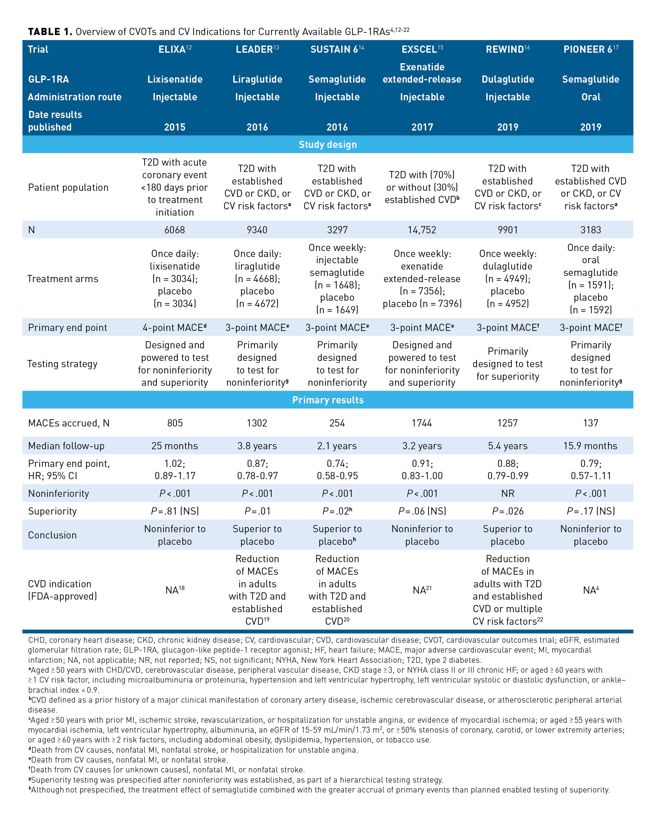 To date, 6 CVOTs have been conducted with the GLP-1RAs currently available in the United States11; an overview of these trials is provided in Table 14,12-22. The results of these CVOTs led to indications for dulaglutide, liraglutide, and injectable semaglutide for reducing the risk of major adverse CV events (MACEs) in patients with T2D with established CVD, or with multiple CV