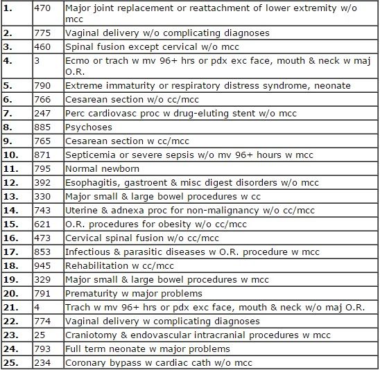 Now contrast that list to the list of the top 25 diagnosis-related groups (DRGs) in aggregate costs for the privately insured (meaning not Medicare or Medicaid) population, for the most recent year available, 2013: