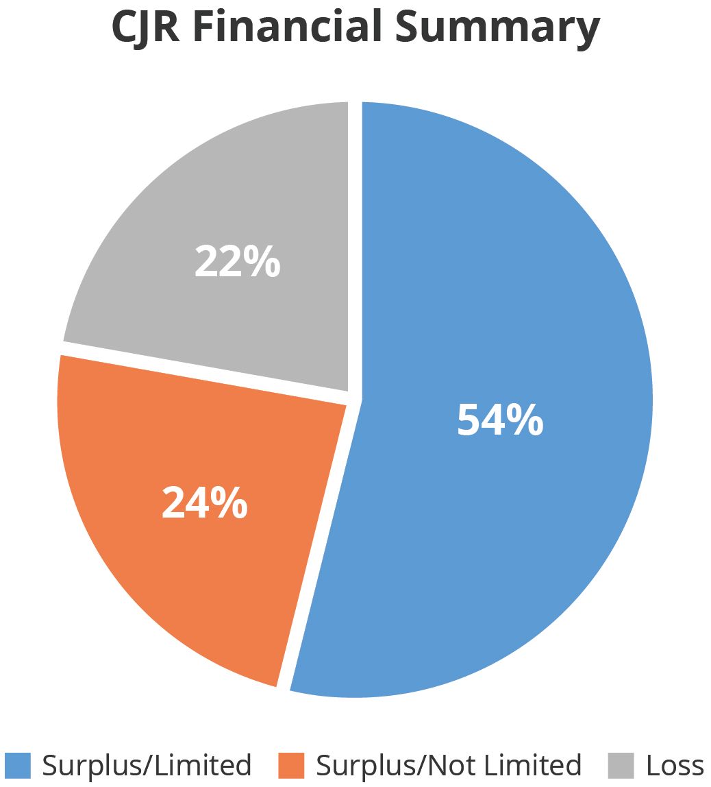 Under the blend of historical and baseline targets used in the first CJR performance year (PY1), any hospital that reduced its episode cost by more than the discount percentage was able to achieve a financial surplus. Apparently, many hospitals were able to implement these types of changes. More than 75% of our client hospitals achieved a surplus and more than half achieved a surplus that exceeded the PY1 stop-gain limit. Less than 25% incurred losses.
