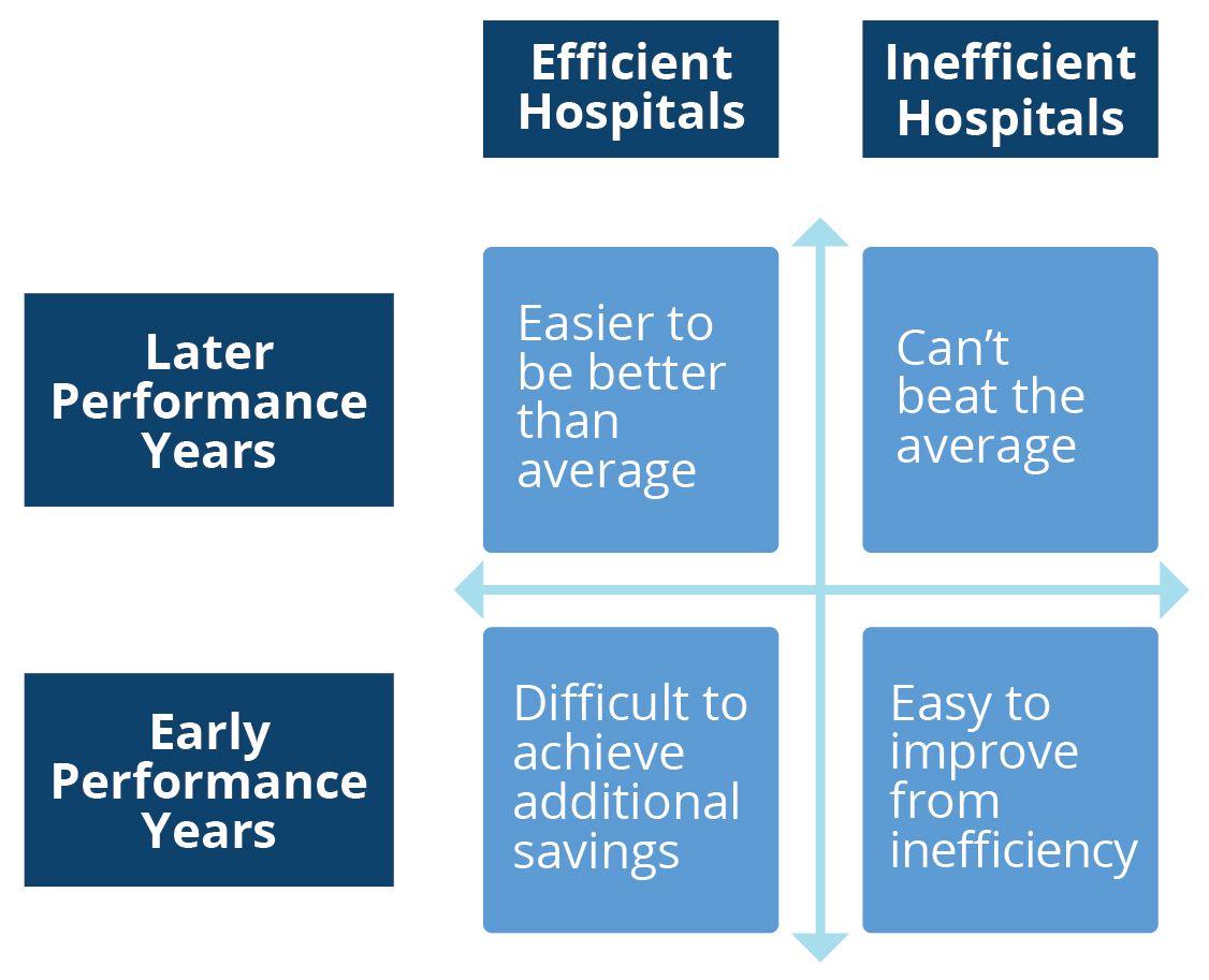 Financial success in the CJR program occurs in 2 ways, depending on the performance year. In the first 2 performance years, the episode financial targets are derived primarily from the hospital’s cost during the initial baseline period (2012-2014), while in the last 3 years of the program, the financial targets are derived primarily from the average episode costs of other hospitals in the same geographic region. Therefore, hospitals whose use of postacute services is generally inefficient (postacute cost exceeding 50% of the total episode cost) have high baseline costs and correspondingly high targets, and may have greater opportunities to reduce the postacute cost and achieve savings during those periods. However, during the last 3 years of the program, targets are increasingly or entirely derived from the regional average costs, which are often significantly lower than an inefficient hospital’s baseline cost. Unless inefficient hospitals have significantly reduced postacute cost during the early years of CJR, they may find the transition to regional targets will reverse any previous surpluses and will instead generate losses in the last 3 years of the program.