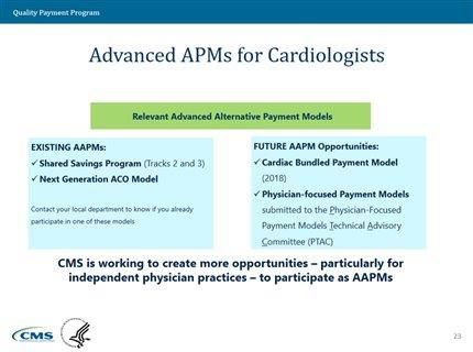“We also hear from a lot of folks that they really wanted more APMs available to them, starting as early as possible. So, we are working hard to have more opportunities for participation in advanced APMs for folks by 2018, including some retrofitting of a bundle payment model, the cardiac bundled payment model, as well as what we hope will be more physician-focused payment models that come forward to the innovation center to the PTAC, the Physician-Focused Payment Model Technical Advisory Committee.”