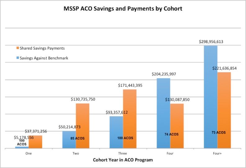 In addition to the realities of the timelines for savings from prevention, care management, and other interventions, ACOs that succeed in implementation are the ones that last in the program. Of the 106 ACOs that started in the MSSP in 2013, now only 74 remain. This is an expected outcome and a good one. Moving from fee-for-service (FFS) to value also involves moving into a more competitive environment. ACO work is hard. It competes with other priorities. Not every ACO is going to succeed in implementing interventions that will make a difference over the long run. A certain amount of creative destruction is necessary in this new, competitive value-driven healthcare world.