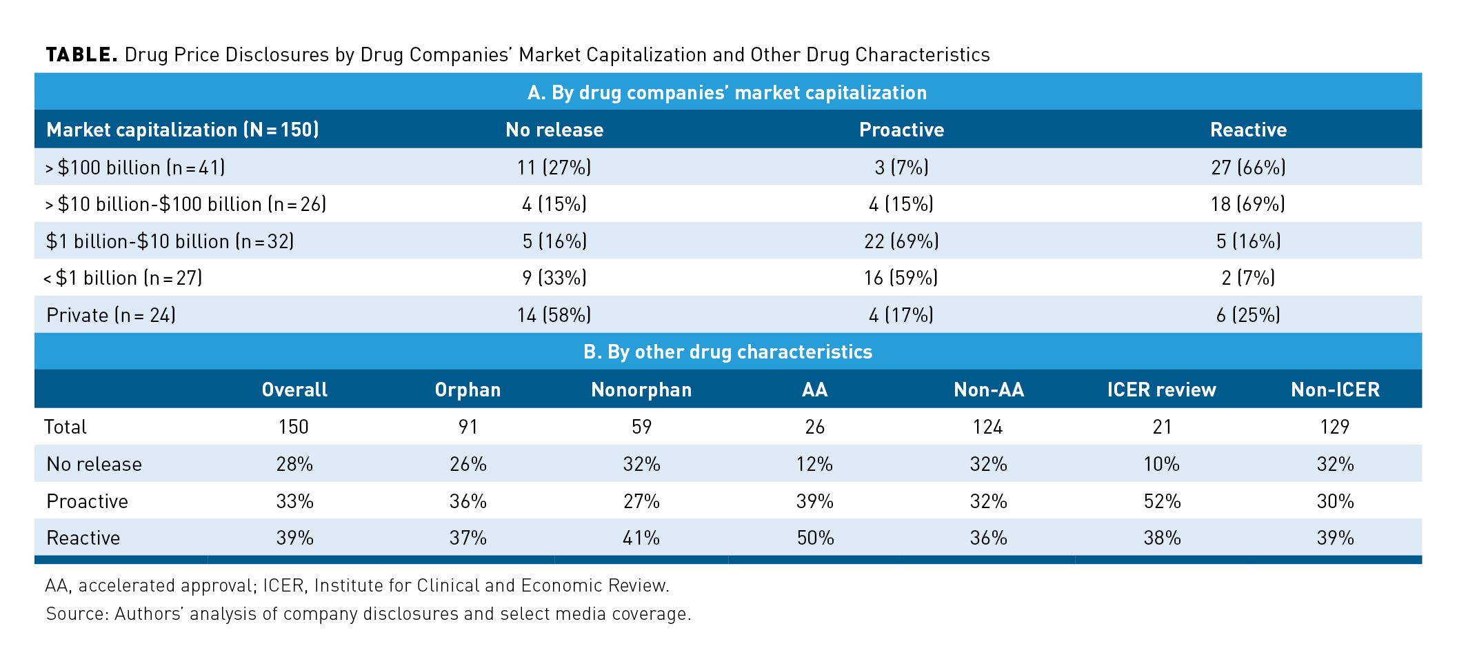 Results: Of 150 drugs, 107 (71%) had publicly disclosed launch prices: 49 proactively and 58 reactively. Proactive disclosure was more common among public companies with smaller market capitalizations—69% for firms worth $1 billion to $10 billion, compared with 7% for those worth more than $100 billion.