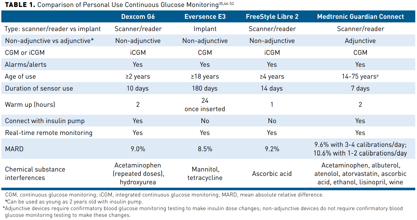 There are 2 types of CGM devices: personal and professional.1 A personal CGM device is owned by the patient and is intended for frequent or continued use, whereas a professional CGM device, which is owned by the provider’s office, not the patient, is placed on the patient in the clinic and is worn for a finite period of time (usually 7-14 days).1 Personal CGM devices, the focus of this activity, are further strati-fied as real-time CGM (rtCGM), which continuously measures and stores glucose levels without prompting, or intermittently scanned (also known as “flash”) CGM (isCGM), which also measures glucose continuously, but requires scanning for storage of values.1 Personal CGM devices are approved for either adjunctive or non-adjunctive use. Adjunctive devices require confirmatory BGM testing to make insulin dose changes, whereas non-adjunctive devices do not require confirmatory BGM testing to make these changes.41 Some personal CGM devices have also been given the designation of integrated CGM (iCGM), which is “designed to reliably and securely transmit glucose measurement data to digitally connected devices, including automated insulin dosing systems, and is intended to be used alone or in conjunction with these digitally connected medical devices for the purpose of managing a disease or condition related to glycemic control.”42 To meet this higher standard set by the FDA, iCGM devices must meet a more stringent accuracy requirement: glucose readings within 15% of the laboratory glucose value when glucose is higher than 70 mg/dL and within 15 mg/dL when glucose is lower than 70 mg/dL. These thresholds must be met at least 70% of the time when glucose levels are between 70 and 180 mg/dL; more than 80% of the time when glucose is higher than 180 mg/dL; and more than 85% of the time when glucose is lower than 70 mg/dL.43 Currently, Dexcom G6 and FreeStyle Libre 2 are the only devices that meet this iCGM criteria.42 Historically, the major differences between the CGM devices were whether they could provide real-time alerts and alarms regarding glucose levels and the person’s target goals.41 Presently, all personal CGM devices have alert/alarm functions and can help the person with diabetes manage acute glycemic events based on high and low thresholds and provide immediate feedback regarding their lifestyle or therapy decisions (eg, diet, exercise, and medica-tion nonadherence). Regulations also require all CGM devices to have an automatic low alarm for blood glucose at 55 mg/dL that cannot be silenced by the user of the device.41 See Table 135,44-52 for a comparison of currently available personal CGM devices. The FreeStyle Libre 3 was cleared for use by the FDA in May 2022. Both the FreeStyle Libre 2 and the FreeStyle Libre 3 have a 14-day sensor life and customizable glucose alarms, which allow the user time to react to mild hypoglycemia rather than requiring assistance from a third party. The FreeStyle Libre 3 is an rtCGM, whereas the FreeStyle Libre 2 is an isCGM.46,53 Additionally, the FreeStyle Libre 3 has the lowest mean absolute relative difference (MARD), an accu-racy standard used for CGM, of all available CGM devices at 7.9%.54