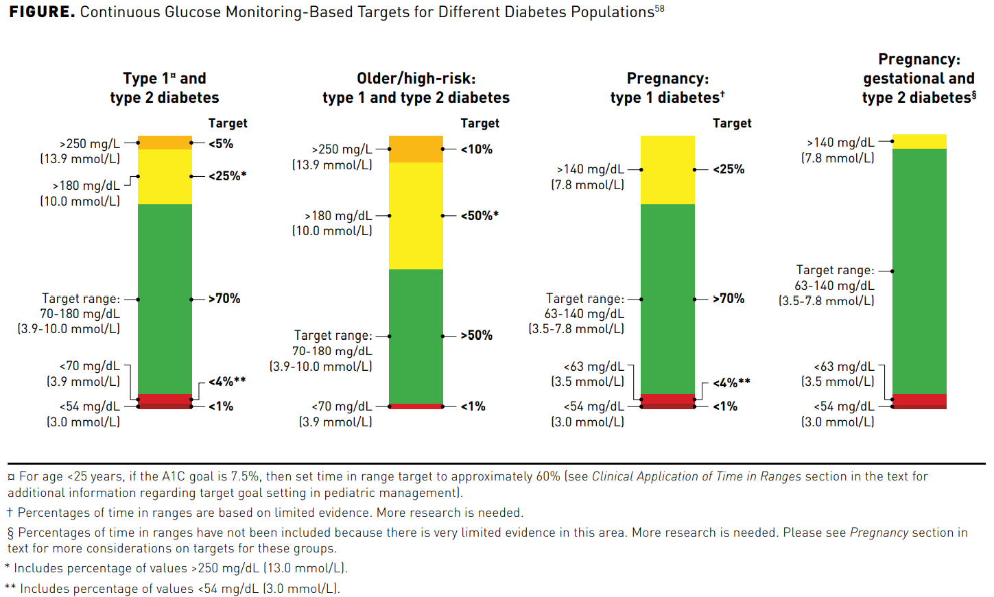 TIR is a measurement presented as the percent the patient’s blood glucose is in range, defined as 70 to 180 mg/dL for persons with T1D and T2D and 63 to 140 mg/dL for pregnant women (see Table 135,44-52 and Figure58). Achieving and maintaining TIR is important for all persons with diabetes. Ideally, the overarching goal for most persons with diabetes is to have TIR at least 70% of the time, while avoiding unaccept-able glycemic peaks and troughs (see Figure58). The Advanced Technologies & Treatments for Diabetes meeting selected this TIR target because it approximates an A1C of less than 7%, the A1C value that significantly reduces the risk of diabetes complications.24 For older or high-risk persons with diabetes, the goal is greater than 50% TIR (see Figure58). If we are targeting tighter control based on charac-teristics such as good health and a long-life expectancy, we may consider a target TIR of 80%.58 When 70% of the glucose readings are within range, one can predict the A1C will be close to 7%. Improving a patient’s TIR from using CGM can reduce the risk of macrovascular and microvascular complications.65,66 Time below range (TBR) is defined as less than 70 mg/dL. For most patients the TBR goal is less than or equal to 4%; however, older patients or high-risk patients should lessen their TBR to less than or equal to 1% (see Figure58). Hypoglycemic events over time contribute to complications and cause physical and psycho-social morbidity, and sometimes mortality. Asymptomatic hypoglycemia further compli-cates care and well-being because it may lead to severe hypoglycemia. Population data have shown that up to 40% of persons with T1D experience up to 3 severe hypoglycemic episodes each year.67 Moreover, nocturnal hypoglycemia is especially concerning and responsible for about half of severe hypoglycemic events.68 In persons with T2D, the risk increases with the use of insulin and secretagogues, lack of glycemic control, kidney disease, and impaired cognition and function.69 Severe hypoglycemia is associated with increased morbidity and mortality.70,71