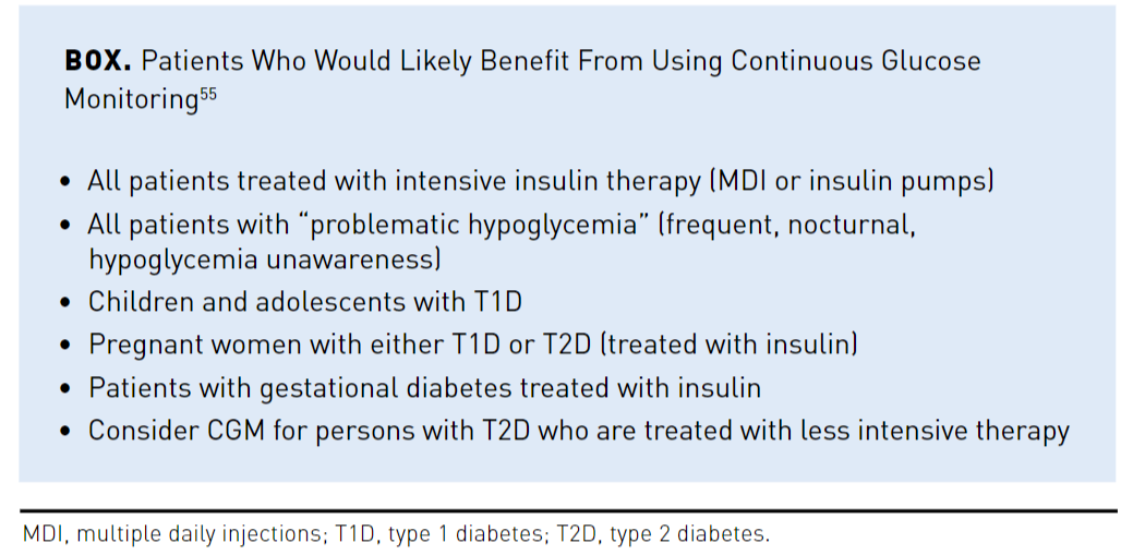 The updated 2022 ADA Standards of Care have expanded their recommendations to include CGM devices as the preferred glucose monitoring device for adults on insulin.1 Specifically, CGM is recom-mended in adults on multiple daily injections (MDI), those solely on basal insulin, or CSII.1 It is also recommended in youth (T1D/T2D) who are on MDI or CSII and as an adjunct to BGM in pregnancy. The ADA recommends a 14-day CGM assessment of time in range (TIR) and glucose management indicator (GMI) be used to accu-rately assess a patient’s risk of hypoglycemia and hyperglycemia. TIR allows for a more real-time assessment of a patient’s risk when compared with A1C.1 The 2021 American Association of Clinical Endocrinology (AACE) guidelines suggest that all persons with diabetes, regard-less of insulin dependency, may benefit from the use of CGM (see Box55). Furthermore, the AACE recommends using an rtCGM over an isCGM for patients on insulin or at higher risk of hypoglycemia. A 14-day CGM evaluation timeframe and a TIR goal of greater than 70% remains the same between the 2 organizations. Individualizing care for each person is also recommended by both organizations.1,55