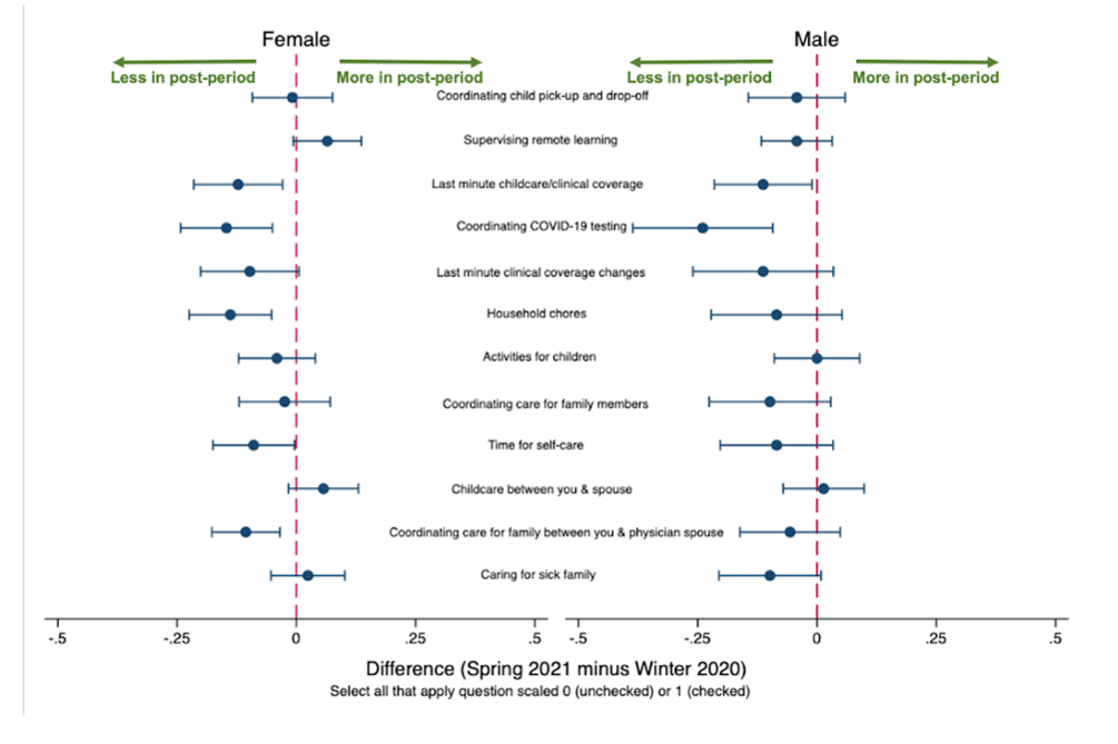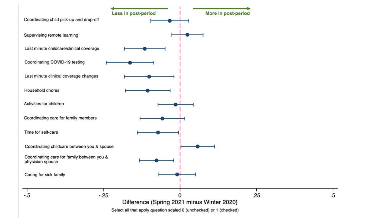 We also found that our female clinicians responded differently than our male clinicians when asked, “During the COVID-19 crisis, what was your greatest family care challenge?” Female clinicians reported feeling less challenged in the post-intervention survey by household chores, time for self-care, and, when applicable, coordinating care between them and their faculty spouse relative to the pre-intervention period. However, despite the reduction, coordinating childcare between the clinician and their spouse remained the most significant challenge for female clinicians in the post-intervention period (Figure 5).