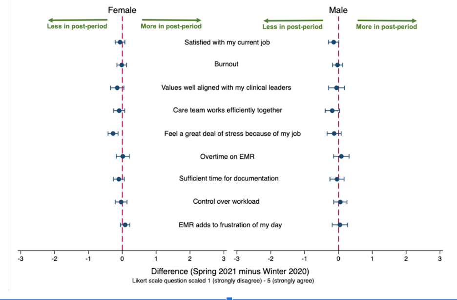 This echoes the persistent disproportionate childcare burden that women shouldered during the pandemic. However, we were pleased to see that when the question “How did participation in the Live Well program make you feel?” was stratified by gender, female clinicians were more likely to report feeling valued as an employee or no change.