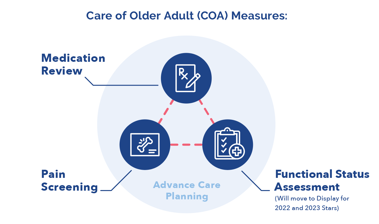The criteria for COA requires all SNPs to document an annual Medication Review and Pain Assessment for each consumer 66 years and older. These two measures factor into the MA plan’s overall Star Ratings score. Updated COA measures will also include a Functional Status Assessment, which was retired but is coming back in contract year 2023 with a revised question set. CMS has announced Functional Status Assessment will be a display measure in contract year 2022.