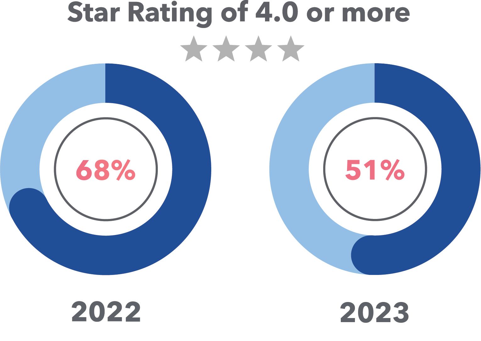 With the COVID-19 public health crisis tapering off, CMS is demanding plans refocus on outcomes by ending critical Star Rating performance safeguards designed to protect plans during the crisis. As a result, 2022 Star Ratings performances that rose to all-time highs have now dropped back down to Earth. CMS notes nearly 70% of MA prescription drug plans earned a rating of 4.0 Stars or higher in the 2022 Star Ratings compared with 51% for 2023.