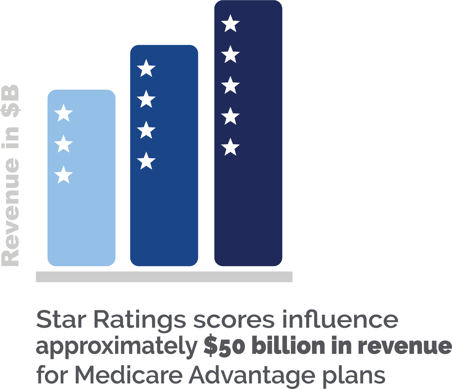 The Guidehouse study went further, documenting that plans improving from a 3.0-Star to 4.0-Star Rating would increase plan revenues between 13.4% and 17.6% through increased enrollment revenue and QBP. In effect, Star Ratings scores direct approximately $50 billion in revenue for MA plans.