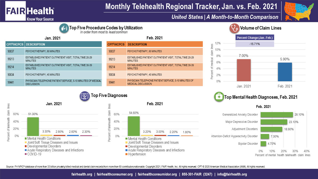 Launched in May 2020 as a free service, the Monthly Telehealth Regional Tracker uses FAIR Health data to track how telehealth is evolving from month to month. An interactive map of the four US census regions allows the user to view an infographic on telehealth in a specific month in the nation as a whole or in individual regions. Each infographic shows month-to-month changes in volume of telehealth claim lines, top five telehealth procedure codes, top five telehealth diagnoses (or diagnostic categories) and top five granular diagnoses within the most common diagnostic category.