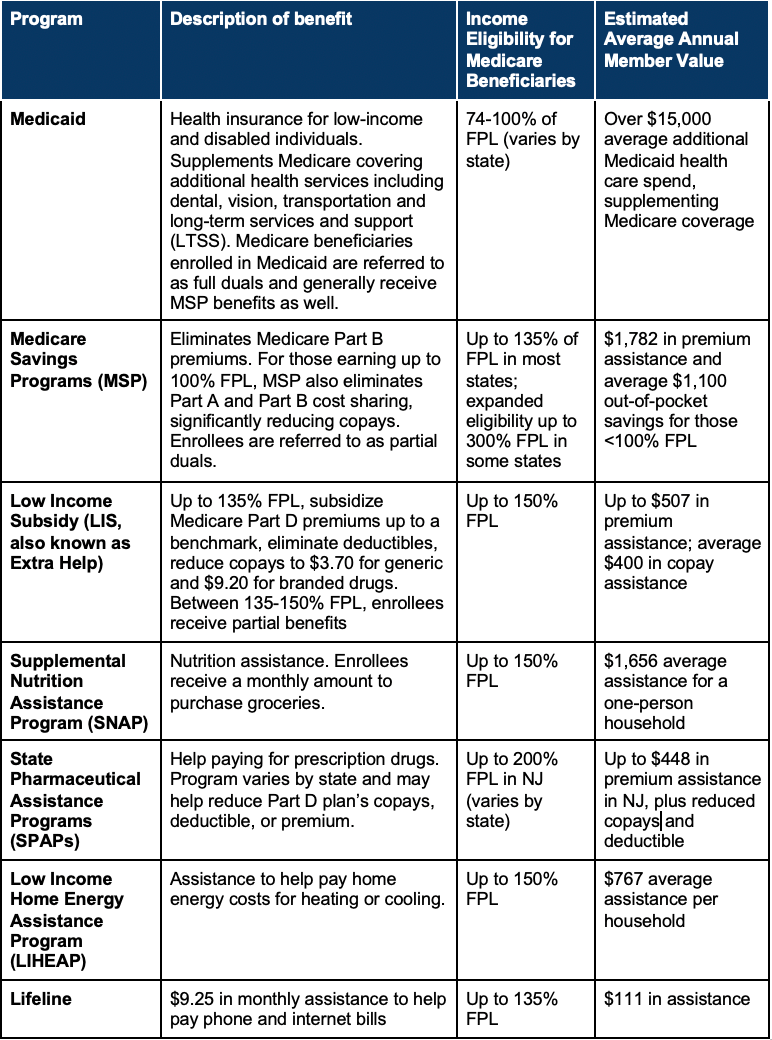 Approximately 32% of Medicare beneficiaries earn less than 150% of the Federal Poverty Level (FPL) and are eligible for at least 7 safety-net programs that help pay for critical necessities like health care and food. This financial support reduces the burdens of poverty, a key social determinant of health (SDOH) and CMS goal. These programs improve access to health care by reducing out-of-pocket medical expenses, greatly improving health outcomes.