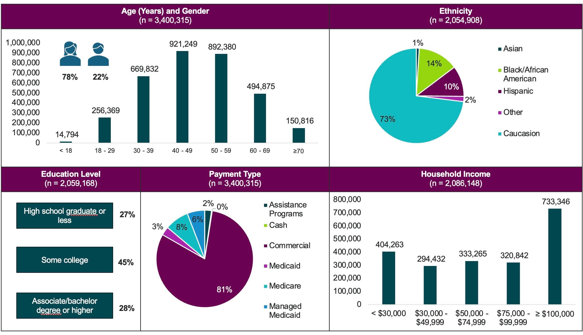 Our analysis represented coverage of 3,400,315 patient lives and more than 8 million claims (Figure 1). Most of the patients were female (78%) and aged 30 to 60 years. Although not available for the full patient cohort, annual household income levels skewed toward $100,000 or higher. Most patients had some college (45%) or an associate/bachelor degree or higher (28%).